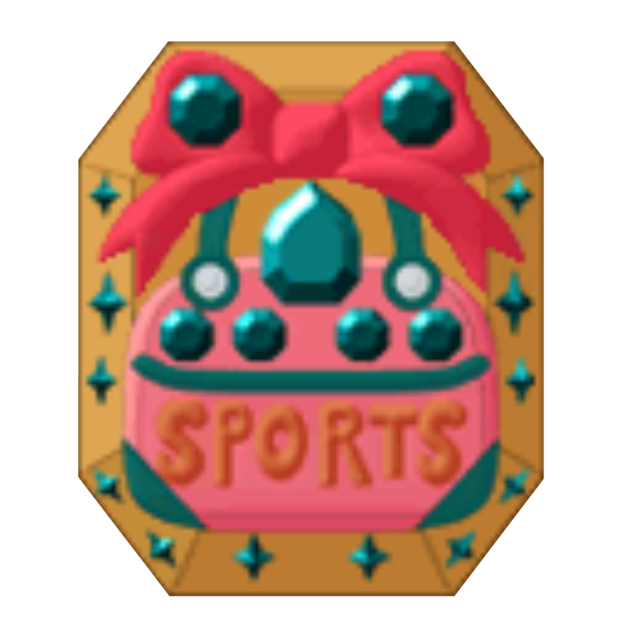 | Chite's Jewel Charm is hexagon-shaped. It first appears in the first series with a base yellow color. His Charm has a light red bow tied to a sports bag, which labels "Sports". It is decorated with several malachites, with four on the bag, two on the bow, two on each sides of the base, and a large one hanging from the bottom-middle of the bow. |
