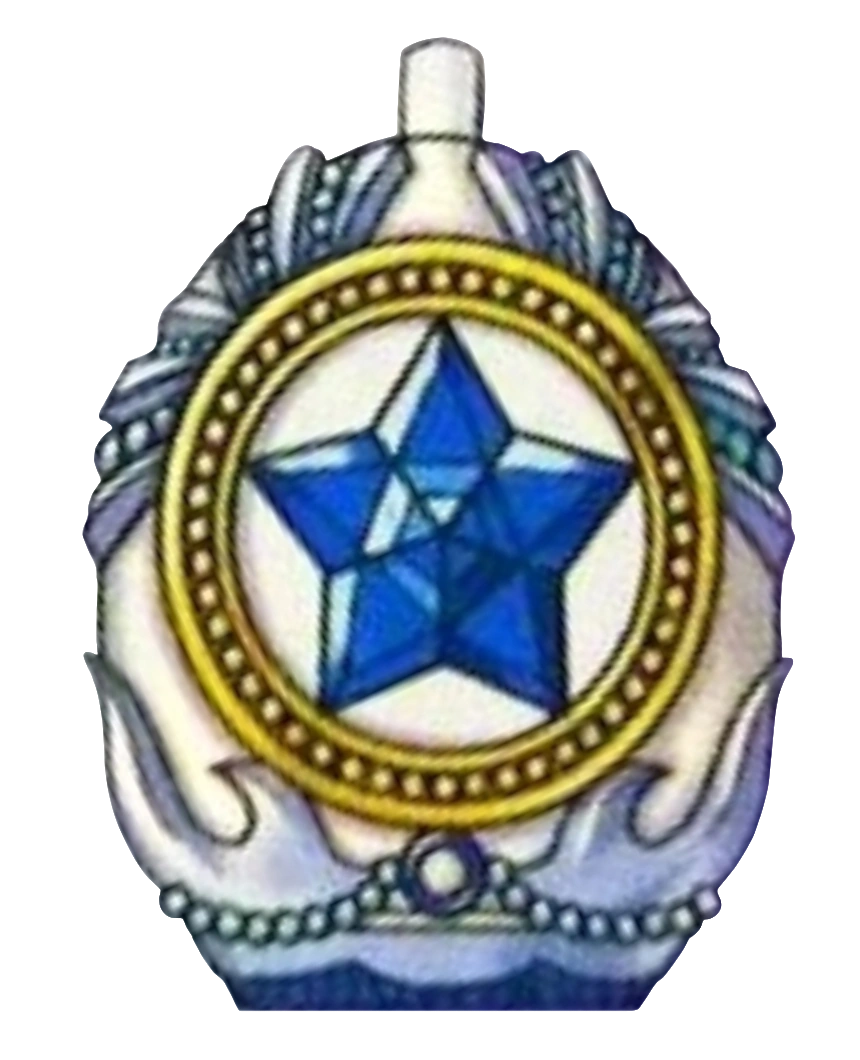 | Granite's Jewel Charm is egg-like, with a flat base and a small, cylinder-like protuberance on top. The bottom is decorated with light blue flares surrounded by beads of the same color; the base appears to be a darker blue. On the center is a golden circle, within which is a blue star. Around the top and the golden ring are wavy light blue ornaments. |