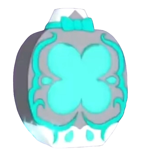 Kris' Jewel Charm is egg-shaped with a flat bottom and a tab on the top. The base of the charm is silver in colour. In the center is a turquoise four leaf clover, which reflects his symbol of luck. On either side of the clover are matching coloured trims for decoration. The tab of the charm features a ribbon with a bow in the middle, also coloured turqouise.