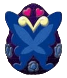| Luea's Jewel Charm is egg-shaped and colored black. It is decorated with an indigo butterfly on the center like on her hairpin, three indigo roses on the bottom and two hot pink hearts on top. |