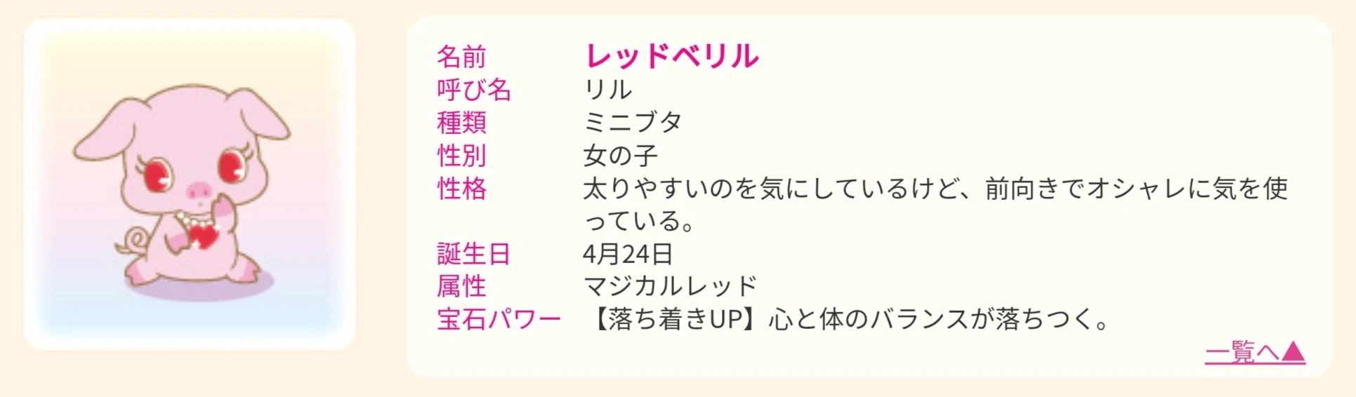 Ryl is a miniature pig with a light pink body and dark pink hooves and nose. Her Jewel Eyes are made out of red beryls. For her attire, she wears a white pearl necklace with a red heart-shaped beryl jewel attached around her neck.