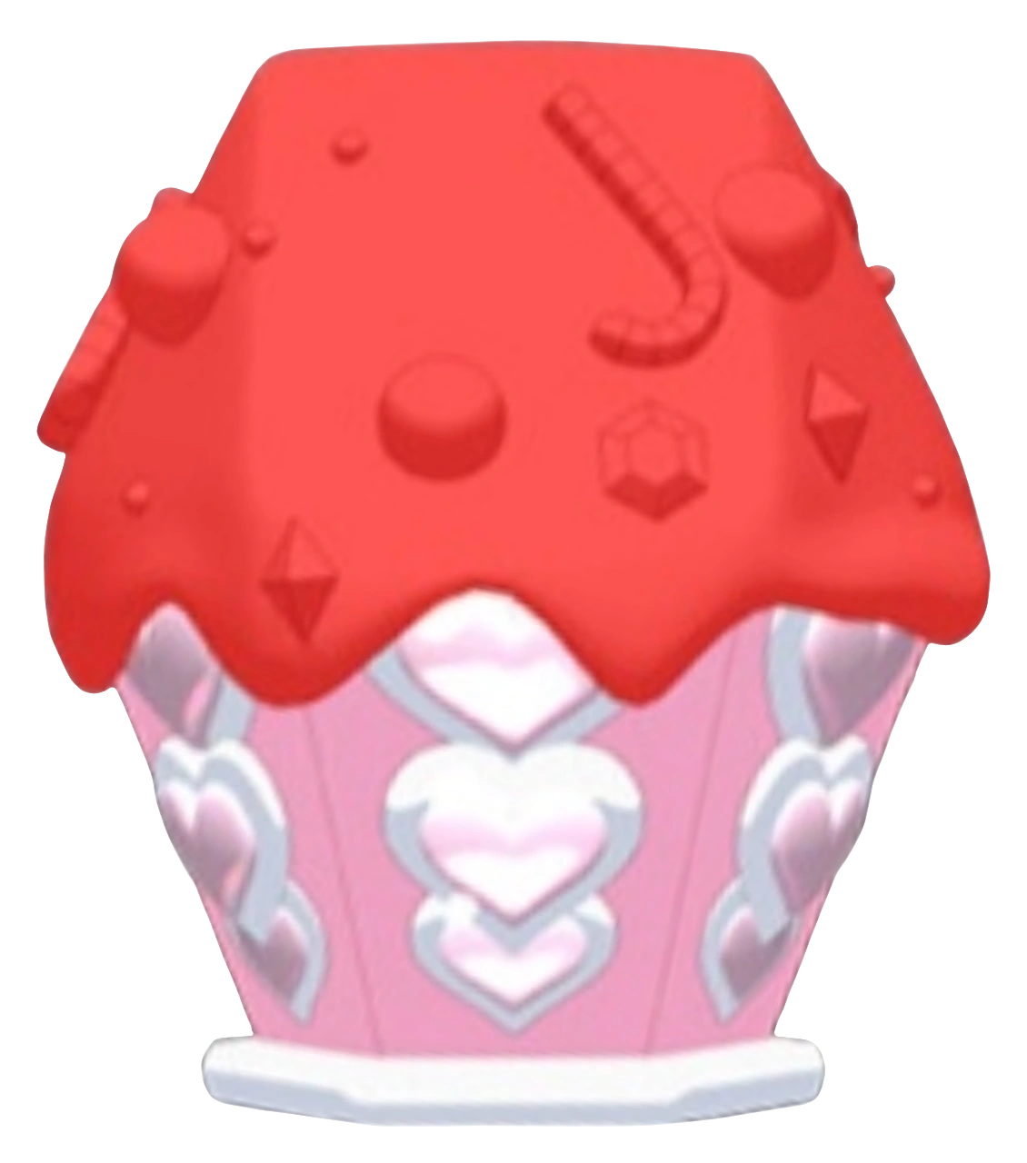 | Ryl's Jewel Charm consists of a hexagonal barrel-shaped object with a white bottom. Along each face are trails of gem hearts formed in a vertical line. The top half of the charm is shaped like a viscous substance, decorated with various sweets. The details have varying colors: |