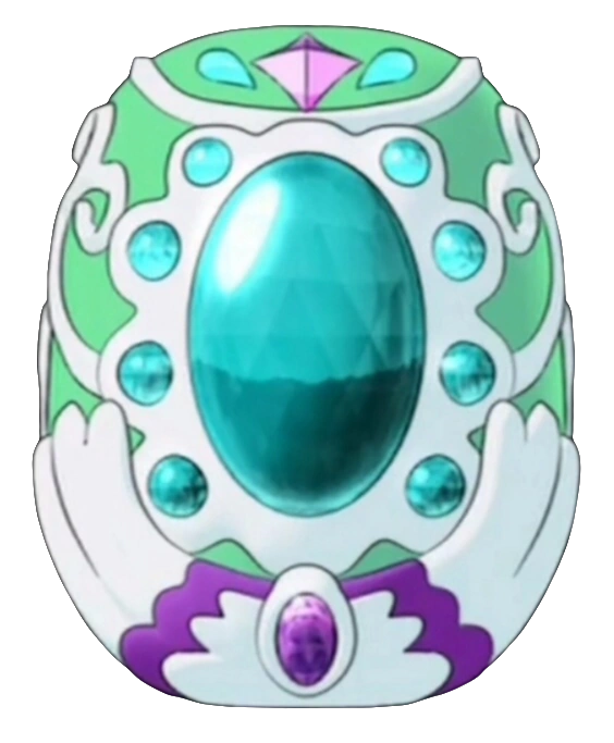| Tata's Jewel Charm is egg-shaped. It is mostly teal in color, with white linings around its top half, topped by one purple and two darker teal crystals. It's base is covered by a white and pink colored wing-like ornament. The center consists of nine turquoises; a large, egg-shaped one in the center, surrounded by eight small and circular ones; all are embedded into the white lining. |