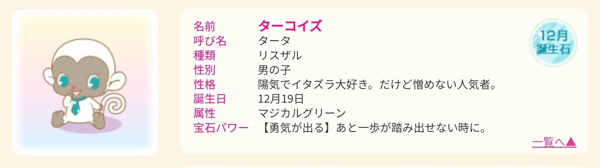 Tata (タータ Tāta?) is a male squirrel monkey Jewelpet who represents Courage.